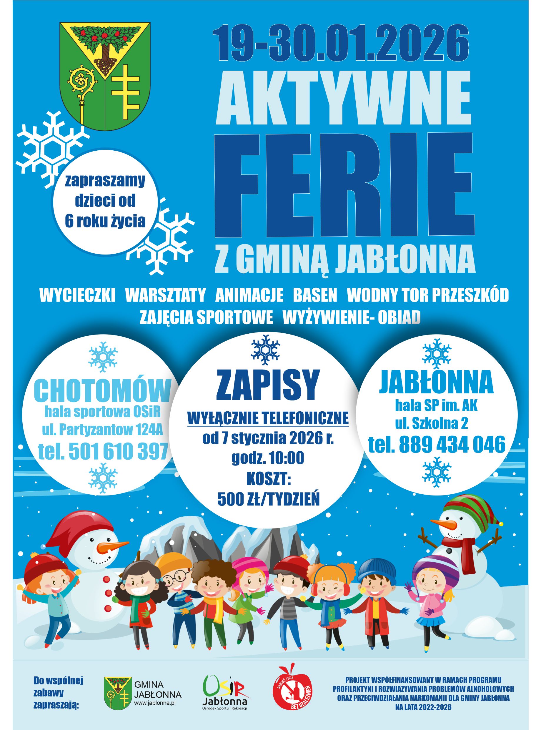 Zbliżają się ferie zimowe- czas odpoczynku, zabawy i- jeśli pogoda się utrzyma- białego szaleństwa. Zapraszamy do spędzenia tego czasu razem z Gminą Jabłonna i OSiR. Przygotowaliśmy mnóstwo atrakcji dla dzieci w wieku szkolnym. Zapisy odbywają się wyłącznie telefonicznie i rozpoczną się w środę 07.01.2026 r. o godz. 10:00.