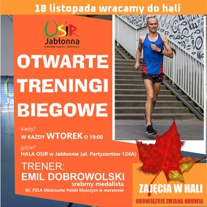 Serdecznie zapraszamy na Otwarte Treningi Biegowe z Emilem Dobrowolskim! Wtorki, godz. 19:00, hala OSiR (wejście od strony bieżni, szatnia: 0.14).